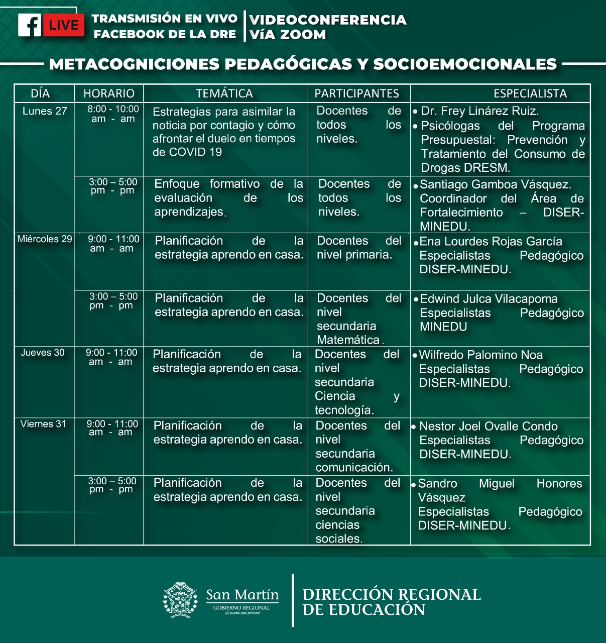La Dirección Regional de Educación invita a la comunidad docente de San Martín a participar de un #CicloDeCapacitaciones vía Zoom, del 27 al 31 de ju...
