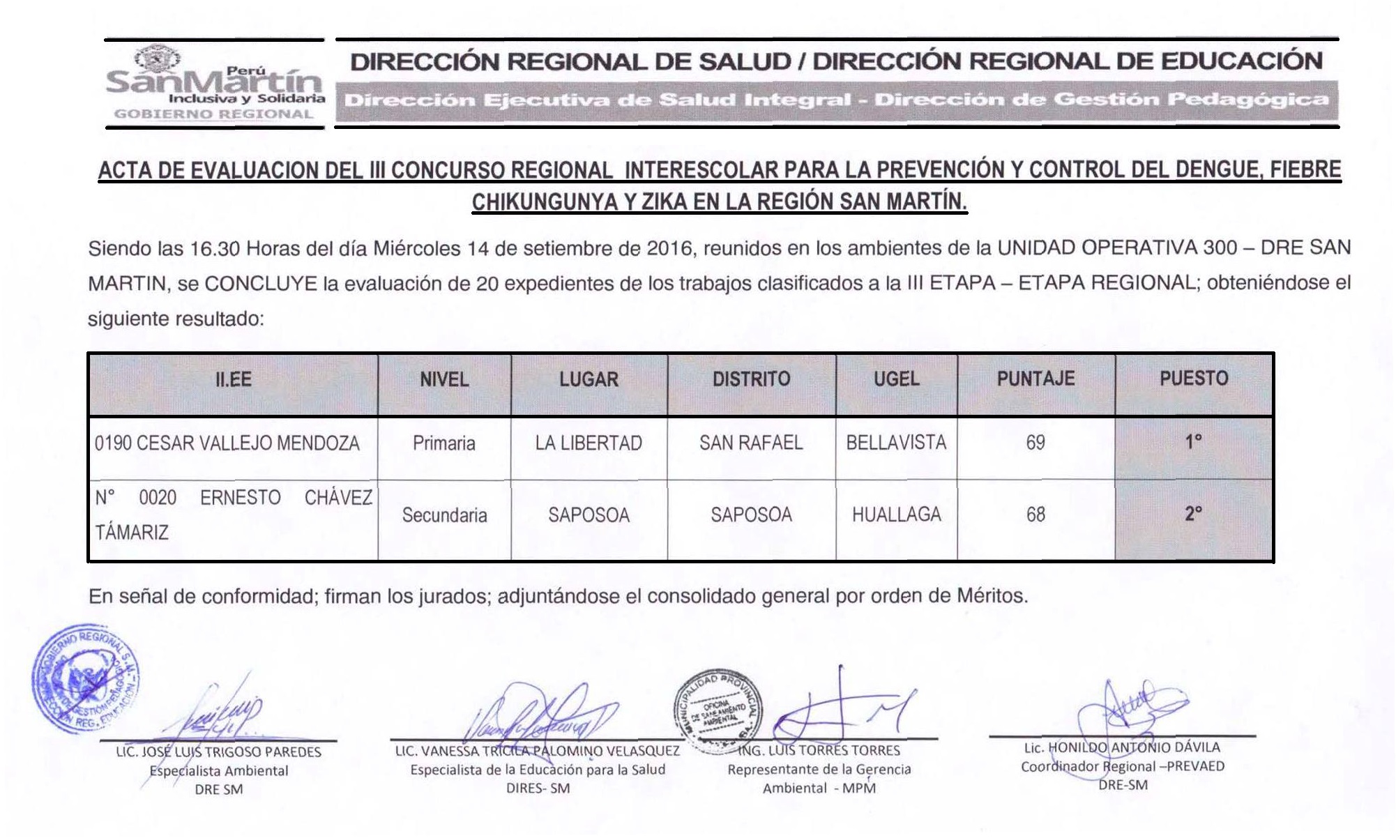 Ganadores del III Concuros Regional Interescolar para la Prevención y Control del Dengue, Fiebre, Chikungunya y Zika - Región San Martín.