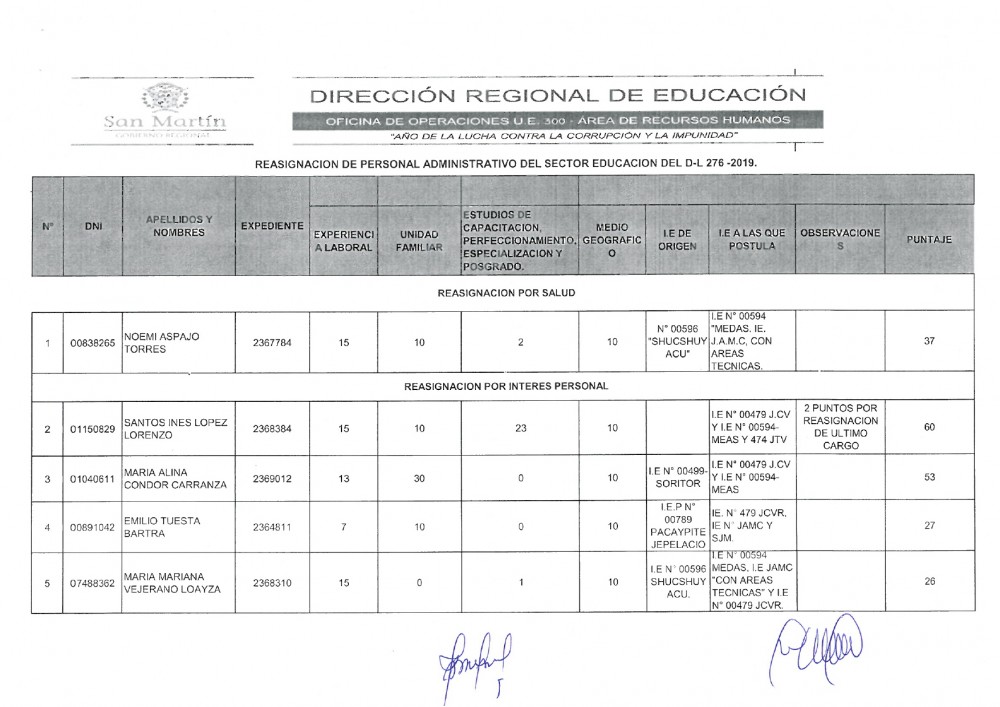 RESULTADOS PRELIMINARES DE REASIGNACIÓN DE PERSONAL ADMINISTRATIVO DEL SECTOR EDUCACIÓN DEL D.L 276-2019